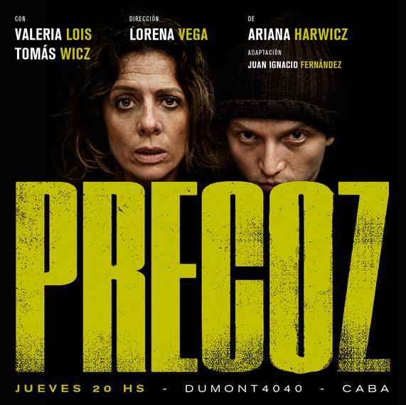 Precoz, una obra basada en la novela homónima de Ariana Harwicz, con dirección de Lorena Vega y las actuaciones de Valeria Lois y Tomás Wicz.