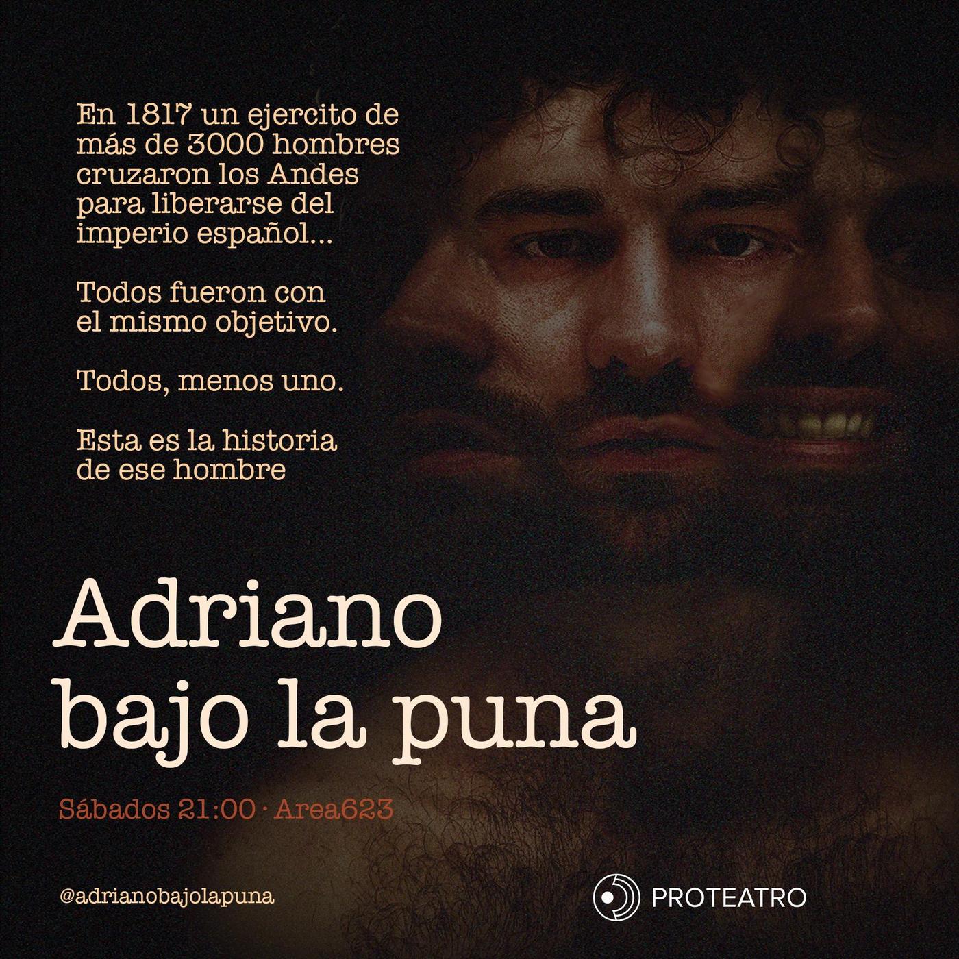 Adriano Bajo La Puna es una propuesta super original de Paul Caballero y Cristian Mariani, la obra cuenta la historia de Patricio, un poeta encarcelado que buscará reencontrarse con el amor, la pieza transcurre en 1817, donde más de 3000 hombres participaron del ejército de Los Andes para librarse del imperio español. Adriano cuenta parte de su travesía desde las Islas Malvinas hasta Mendoza, la adversidades de la cordillera de los Andes y la gloriosa batalla de Chacabuco.