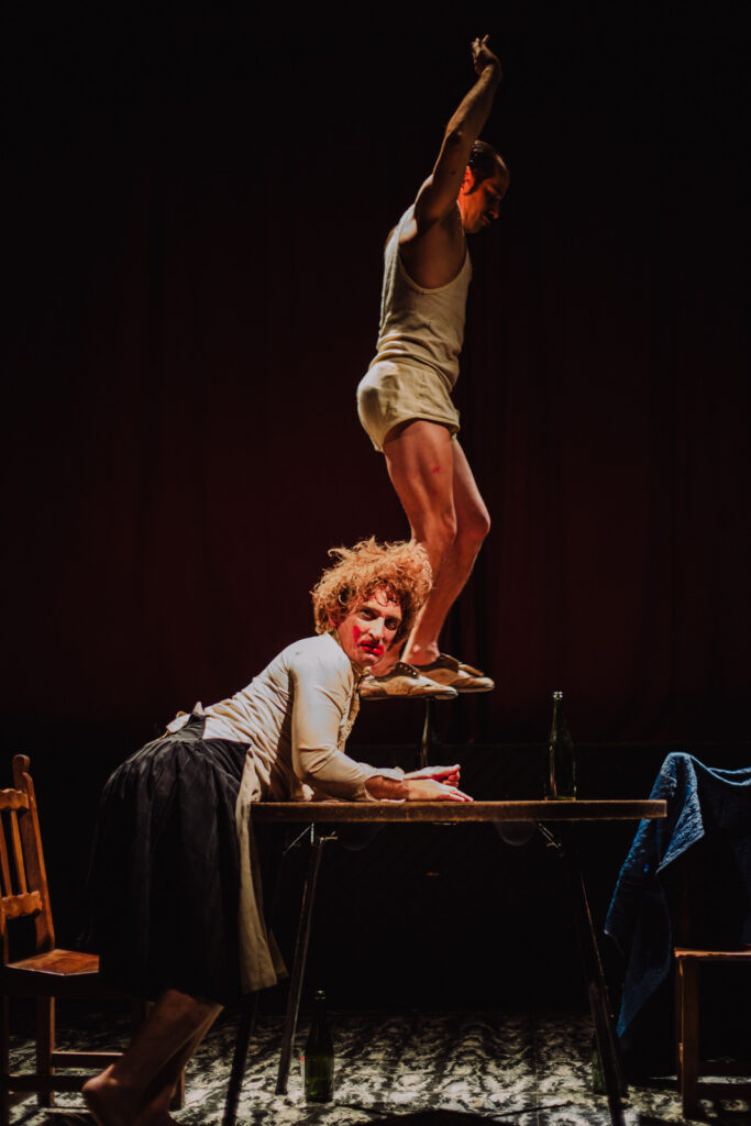 Una historia de amor grotesca y delirante. Vasos, botellas y dos hombres en lo profundo de una casa en ruinas a punto de derrumbarse al igual que sus mentes. Una obra de Circo minimal y Teatro de objetos. Sábado 4 de noviembre, 22:30 horas en El Galpón de Guevara, entradas por Alternativa Teatral