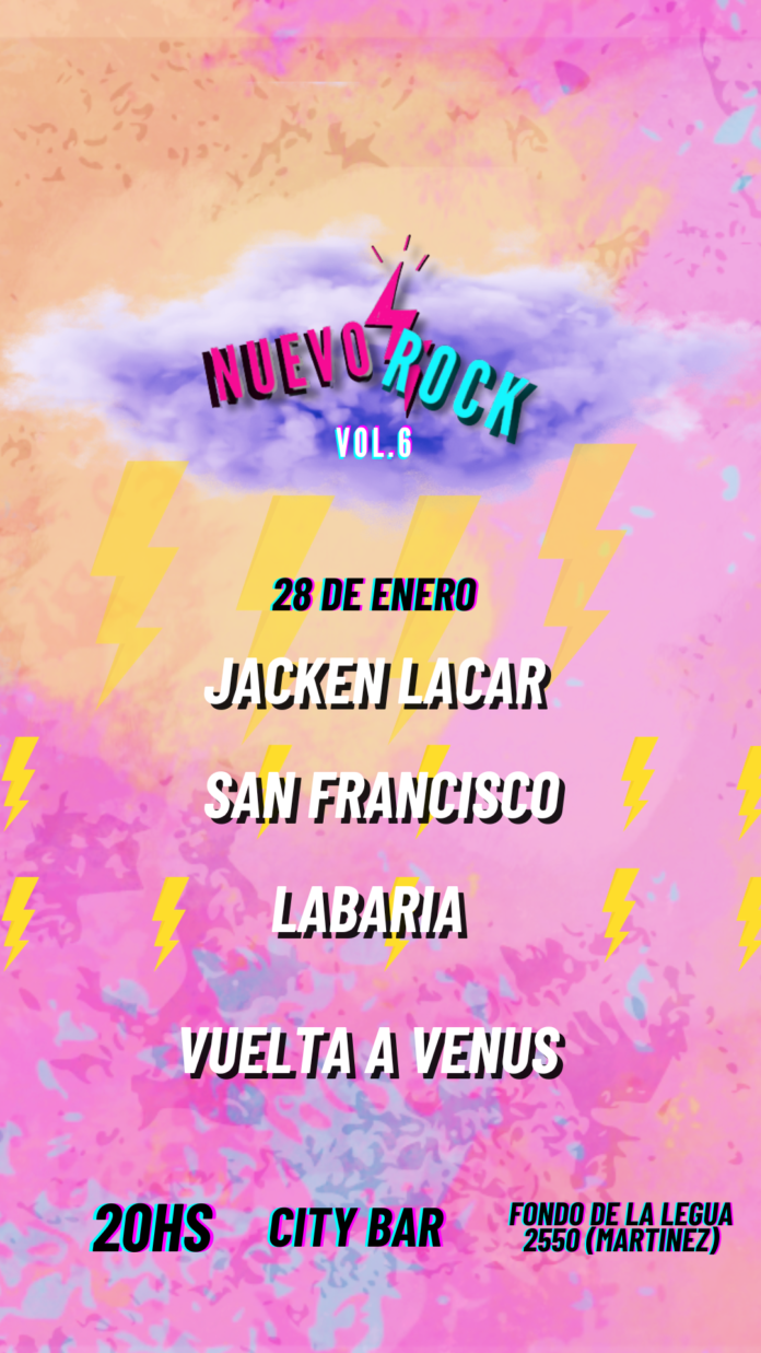 El próximo 28 de enero desde las 19hs. en el histórico City Bar de Martínez (Fondo de la Legua 2550, Martínez, San Isidro), llega la 6ta Edición del Ciclo Nuevo Rock: el proyecto ideado por el líder de Labaria (@labaria_musica), Facundo Tomás Gutierrez, para darle lugar a los nuevos músicos y bandas del rock local. En esta Edición estarán presentes Labaria, San Francisco, Jacken Lacar y Vuelta a Venus, todas oriundas de la zona Norte de la Pcia de BsAs.