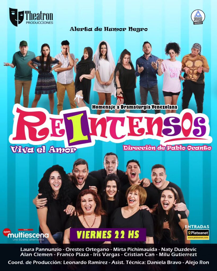 Re Intensos, comedia de teatro breve en 5 bloques. El amor nos alegra y también nos puede hacer sufrir, muchas son las experiencias que hemos tenido, y en Re Intensos disfrutaremos de las diversas etapas del amor y sus matices, una boda “perfecta”, “un amor toxico”, “los calores de la edad” o “el aburrimiento” dentro del matrimonio, serán algunos de los casos que con mucho humor negro, podrán disfrutar en cada función. Homenaje al amor y a grandes dramaturgos venezolanos: Nazoa y Cabrujas.