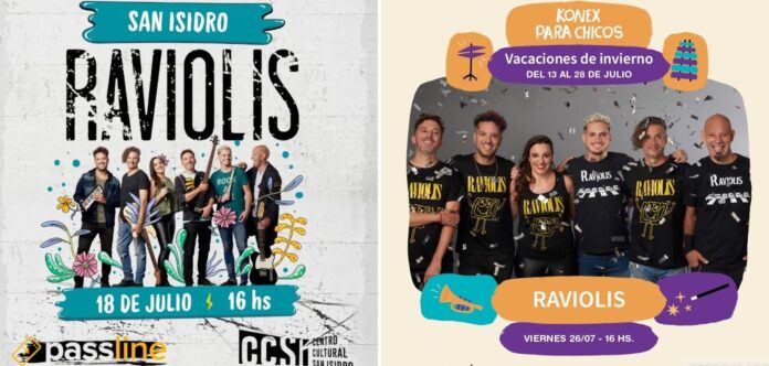 Raviolis se presentará el 18 de julio a las 16:00 horas en el Centro Cultural San Isidro (Av. del libertador 16138, San Isidro) y el 26 de julio a las 16:00 horas en Ciudad Cultural Konex (Sarmiento 3131, CABA) en el marco de una nueva edición de Konex para Chicos; en ambos casos con entrada desde $12.000, disponibles en venta online o en boletería.