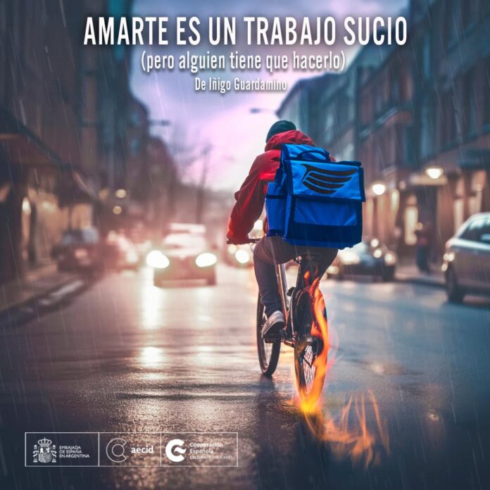 Llega por primera vez a la Argentina la obra del dramaturgo español Iñigo Guardamino. Se trata de su texto nominado a los premios MET de España “Amarte es un trabajo sucio (pero alguien tiene que hacerlo)” que expone la nueva problemática laboral del sector Delivery. Esta obra, dirigida por Raúl Garavaglia, cuenta con el apoyo de Centro Cultural de España en Buenos Aires, dependiente de AECID – Embajada de España.