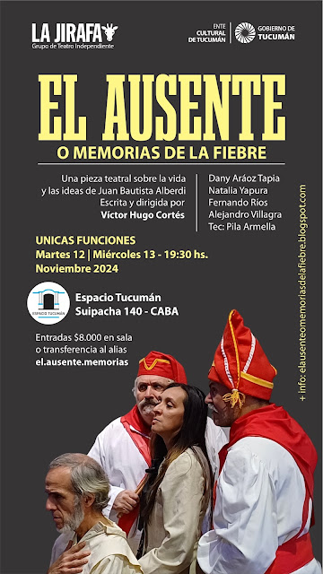 Desde Tucumán llega a Buenos Aires la obra “El ausente o memorias de la fiebre”, escrita y dirigida por Víctor Hugo Cortés y las actuaciones de Dany Aráoz Tapia, Natalia Yapura, Fernando Ríos y Alejandro Villagra. La pieza nos habla sobre la vida y las ideas del principal prócer civil tucumano Juan Bautista Alberdi, la misma esta coproducida por el Ente Cultural de Tucumán y el grupo de Teatro Independiente La Jirafa.