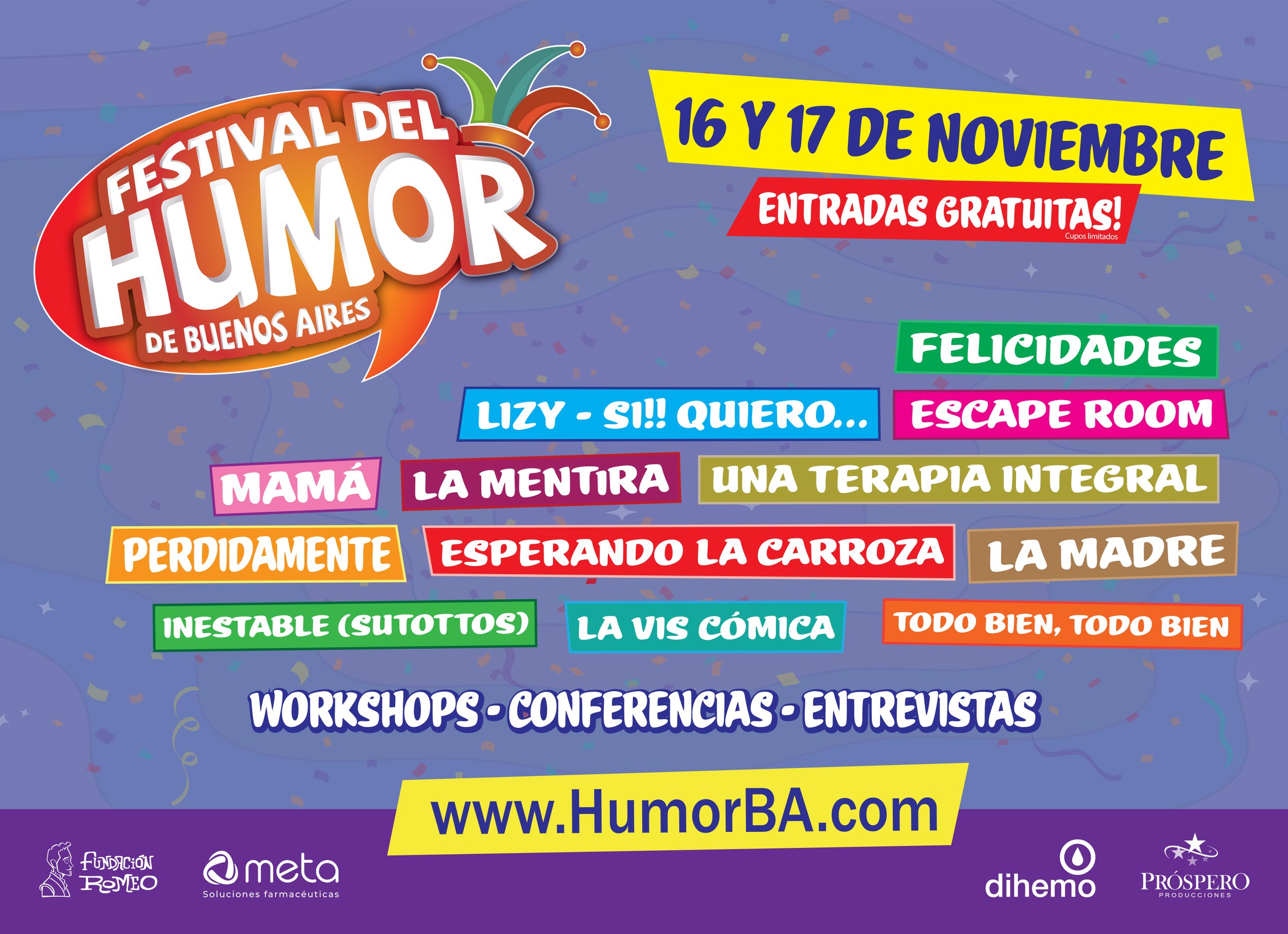 El Festival del Humor de Buenos Aires 2024 organizado por Fundación Romeo y Próspero Producciones presenta un cupo limitado de entradas sin cargo para disfrutar de estas comedias éxito de la cartelera porteña, el 16 y 17 de noviembre. Además, habrá diversos workshops. conferencias y entrevistas. Entradas disponibles en Eventbrite.