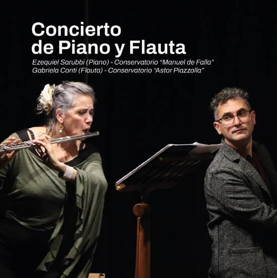 Este martes 19 de noviembre a las 20 h , el Pianista y Profesor del Conservatorio Manuel de Falla, Ezequiel Sarubbi y la Flautista y Profesora del Conservatorio Piazzolla, Gabriela Conti, brindarán un concierto, en el Anexo 3 de nuestra Casa de Estudios, ubicado en Humberto 1° 3171 de la Ciudad Autónoma de Buenos Aires.
