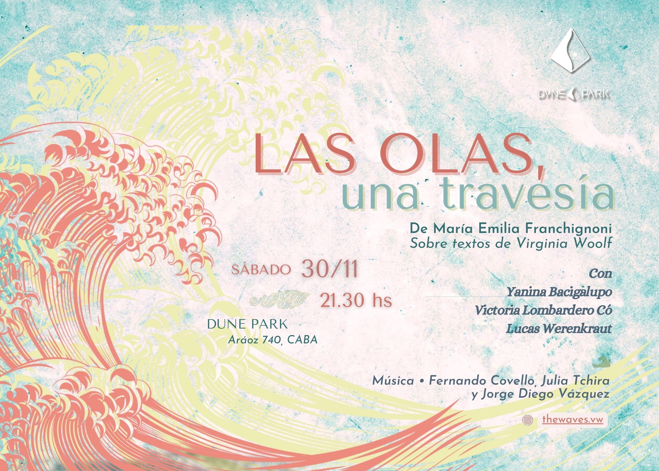 El sábado 30 de noviembre a las 21.30 horas se estrena en el espacio Theater del Centro Cultural de Artes Digitales Dune Park “Las olas, una travesía”, escrita y dirigida por María Emilia Franchignoni, con música de Fernando Covello, Jorge Diego Vázquez Salvagno, Julia Tchira y la intervención sonora en vivo de Lucas Werenkraut.