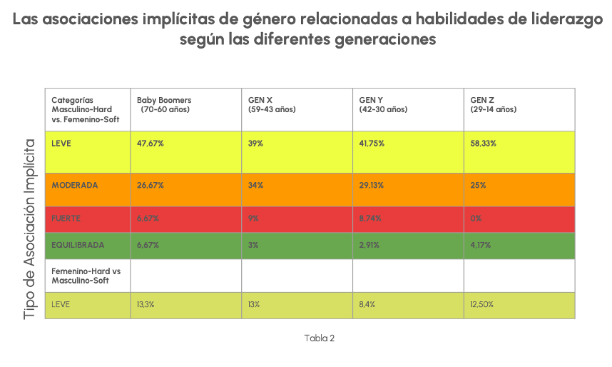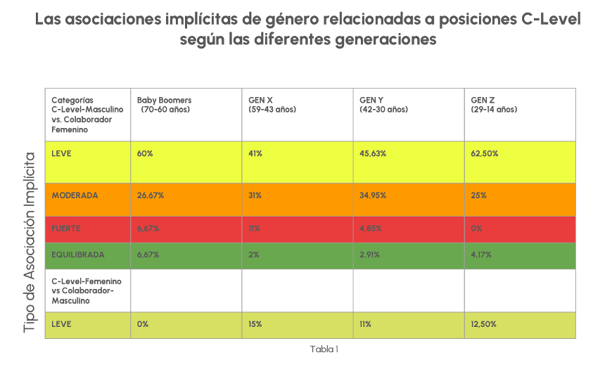 Si observamos el gráfico, no hay grandes diferencias entre las generaciones respectos a sus asociaciones implícitas y esto puede ser un mal augurio, sobre todo, los resultados de la Gen Y quienes son los deberían estar cambiando hacia la diversidad, equidad e inclusión como grandes valores del mundo del trabajo.