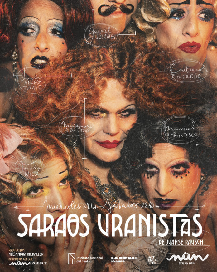 Saraos uranistas fue la forma en que el sistema médico y policial higienista de principios del siglo XX en Argentina llamó a las fiestas nocturnas donde se reunían, principalmente, las maricas y travestis de la época. Estos encuentros, que despertaban el pánico moral de la sociedad porteña del 1900, fueron capturados y detallados tanto en archivos de psiquiatría como en notas periodísticas del momento, siempre haciendo foco en lo depravado, lo torcido y lo desviado del asunto. Saraos Uranistas es una obra de teatro musical que surge de imaginar un improbable evento histórico: el encuentro de La Bella Otero, travesti porteña, y sus amigas con Francisco De Veyga, médico de la policía de Buenos Aires. El delirio se filtra en el discurso médico. Fantasear con imágenes del pasado que nos prometen otros futuros. Saraos Uranistas es un ejercicio de re-imaginación, un “qué hubiera pasado sí” que nos habilita una silueta de utopía.