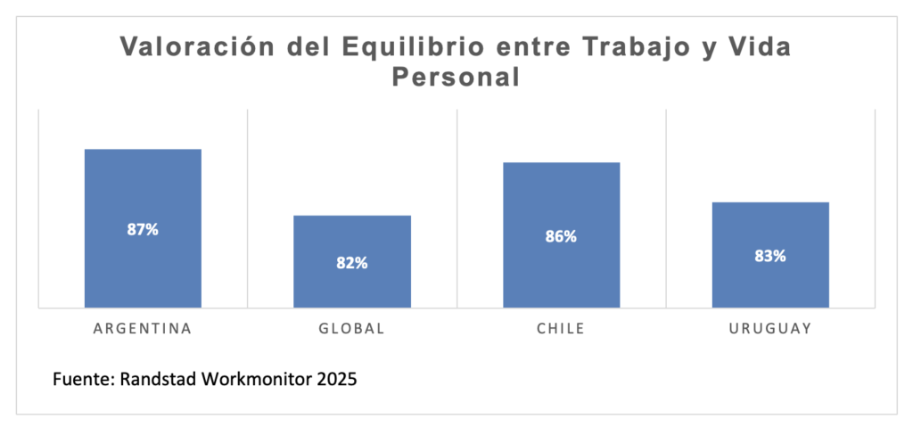 Al analizar esta variable a nivel regional, los trabajadores argentinos son los que más valoran el work & life balance en un 87%, seguidos en segundo lugar por los trabajadores chilenos con el 86% y, finalmente, los trabajadores uruguayos con el 83%.