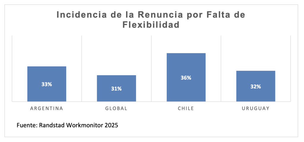 Al consultar a los encuestados si alguna vez habían renunciado a un empleo por no ofrecerles la suficiente flexibilidad, el 36% de los chilenos, el 33% de los argentinos y el 32% de los uruguayos indicaron haber dejado alguna vez un empleo porque el esquema de trabajo no era lo suficientemente flexible de acuerdo a sus necesidades. Por su parte, la cifra más baja se registra a nivel global, donde solo el 31% de los encuestados indicó haber renunciado a un trabajo por falta de flexibilidad.