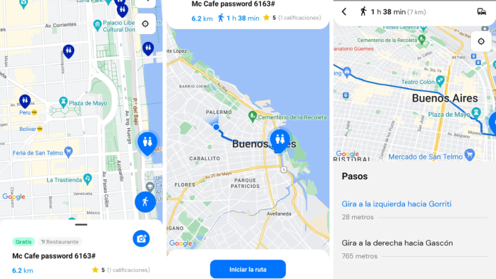 La interfaz es simple e intuitiva, muy importante a la hora de ser usada en situaciones de urgencia. Al seleccionar un baño, la aplicación muestra la distancia exacta y ofrece indicaciones paso a paso para llegar. Al presionar el ícono de persona caminando, se despliega una lista detallada con las calles y metros que hay que recorrer hasta el destino, similar a cualquier aplicación de navegación.