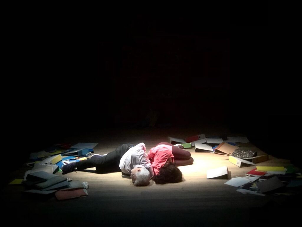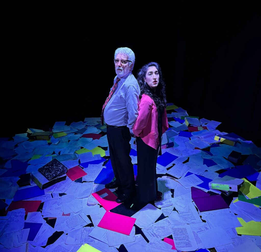Víctimas de un robo, la escribana y su secretario quedan encerrados, atados espalda con espalda en el archivo de la escribanía. En el lugar más inhóspito, el caos original deviene en un planteo intimista de “dos personas solas, dos solitarios ” como los describe la autora.