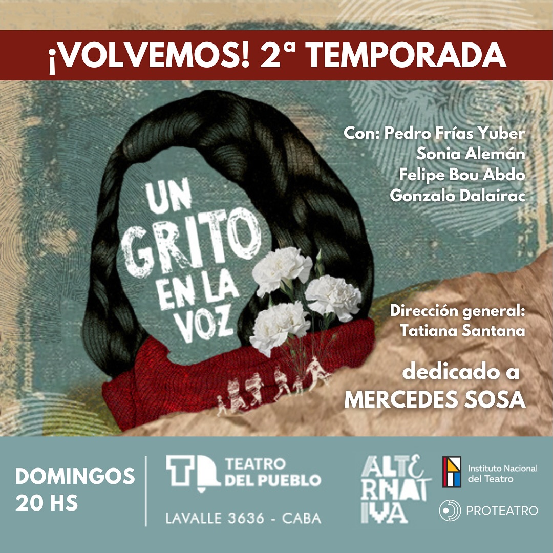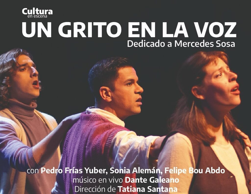 El Domingo 9 de Marzo vuelve por 4 únicas funciones la obra musical que homenajea a Mercedes Sosa: “Un grito en la voz”, con dirección y dramaturgia de Tatiana Santana y las actuaciones de Pedro Frías Yuber, Sonia Alemán y Felipe Bou Abdo.