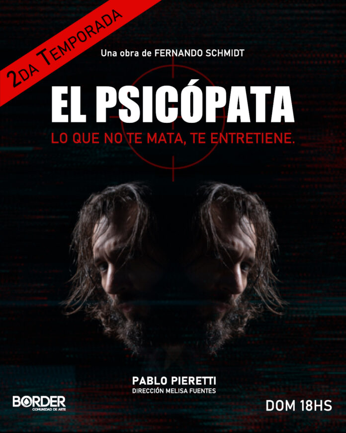 A partir del 6 de abril llega la segunda temporada de “El Psicópata” de Fernando Schmidt, con dirección de Melisa Fuentes y la actuación del actor Pablo Pieretti, la obra se podrá ver los días domingos a las 18:00 horas en el Teatro Border.