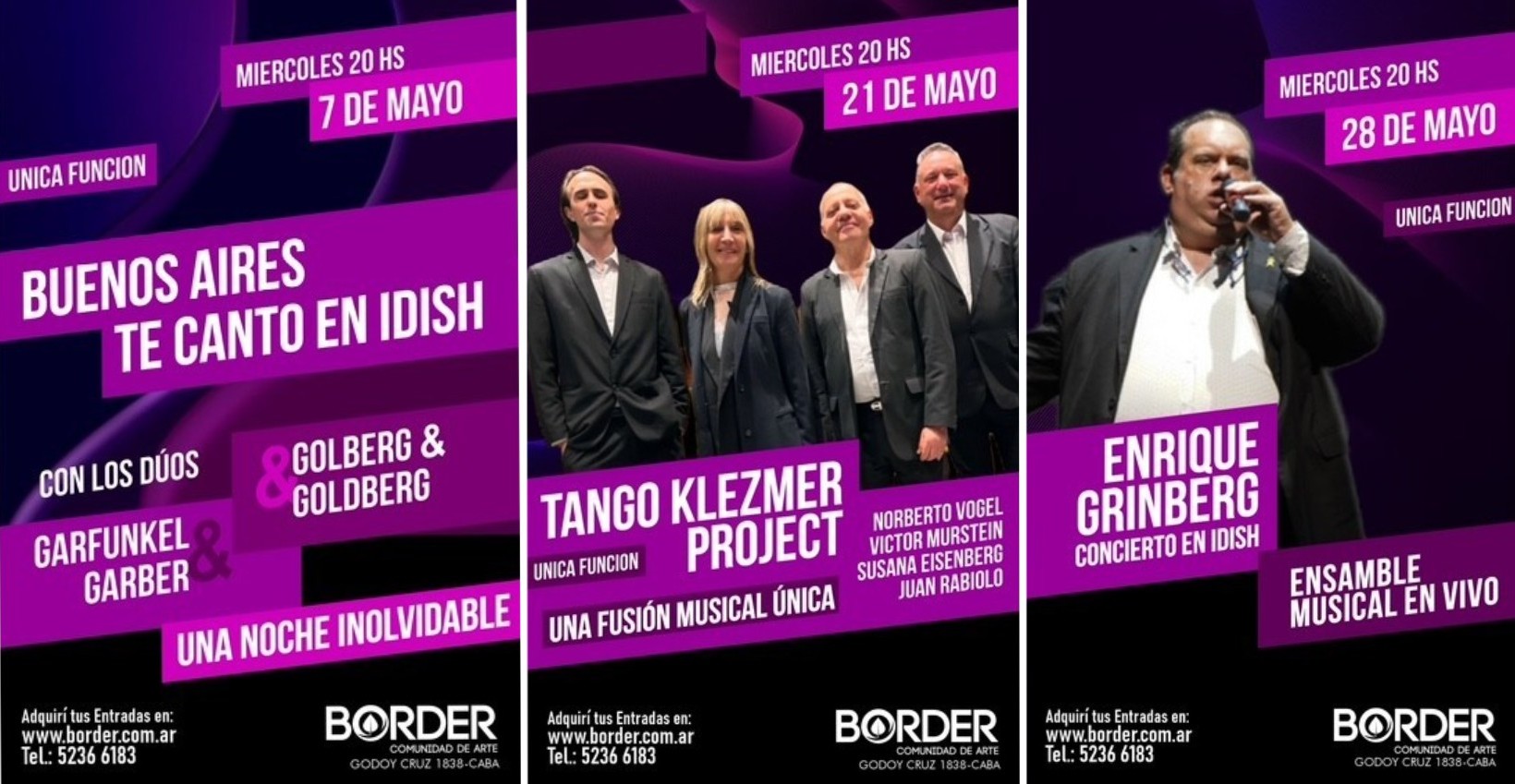 El cantante y jazan Enrique Grinberg llega al Teatro Border, acompañado por tres músicos maravillosos, para deleitarnos con un espectáculo que recorrerá las canciones más reconocidas del Idish. Forman parte del recital Anel Ghelman en teclado, Elena Buchbinder en violín y Matías Tchicourel en clarinete.