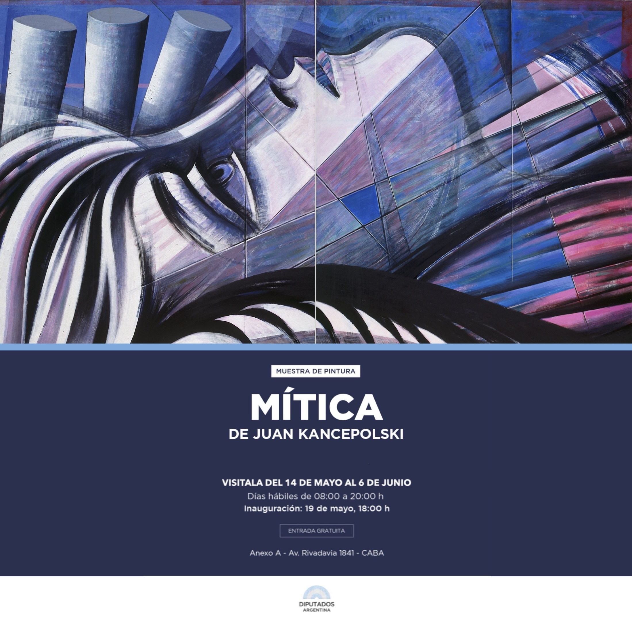 Mítica, la nueva exposición del maestro de la pintura argentina Juan Kancepolski, se presenta en el Congreso de la Nación (Av. Rivadavia 1841) desde el miércoles 14 de mayo hasta el viernes 6 de junio. La entrada es gratuita y el ingreso es de 8 a 20 horas.