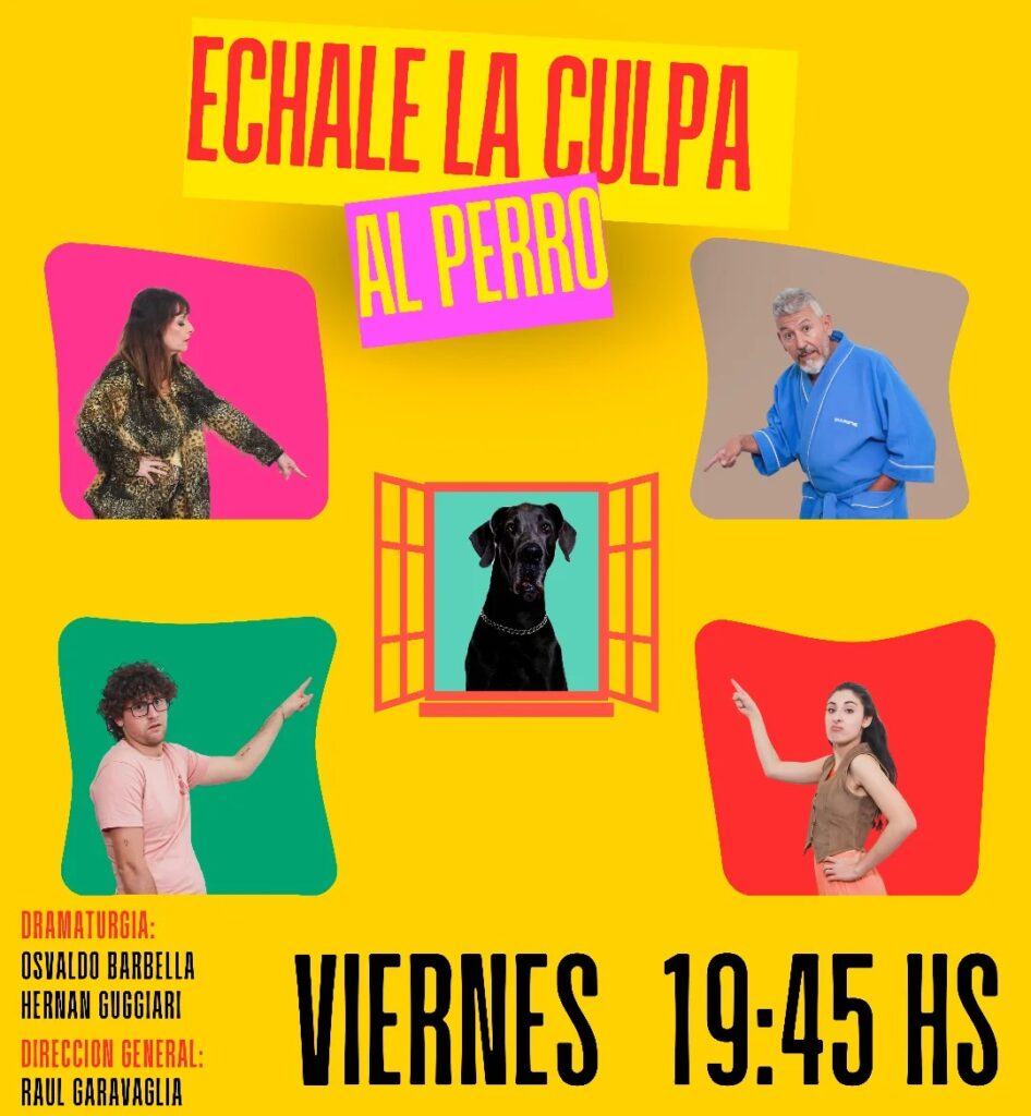 El viernes 4 de julio se estrena “Échale la culpa al perro” con dramaturgia de Osvaldo Barbella y Hernán Guggiari, dirección de Raúl Garavalglia (“Amarte es un trabajo sucio…”, “El Che y yo”, etc.) y las actuaciones de Mariela Barcos, Roberto Acosta, Oriana Parrotta y Tomas Fiszman “Bamba”.