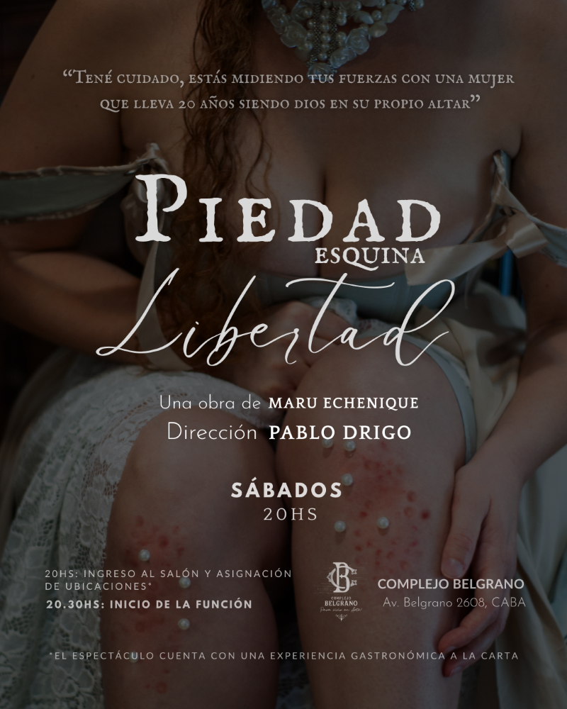 “Piedad, esquina Libertad” se adentra en los secretos de un prostíbulo porteño a comienzos del siglo XX. Un musical sobre poder, silencio y deseo. Un espacio elegante y opresivo donde el poder se ejerce entre sombras y las mujeres buscan abrirse camino en una sociedad que las condena al silencio.