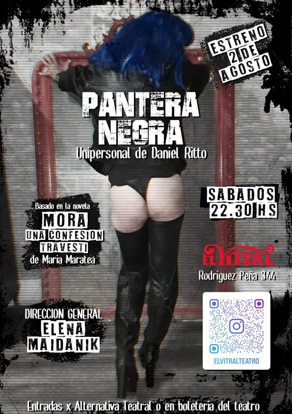 Luego del sensacional suceso de “Luca vive”, el versátil Daniel Ritto llega al Teatro El Vitral con “Pantera Negra”, un nuevo y sorprendente unipersonal de este genial actor, director y dramaturgo.