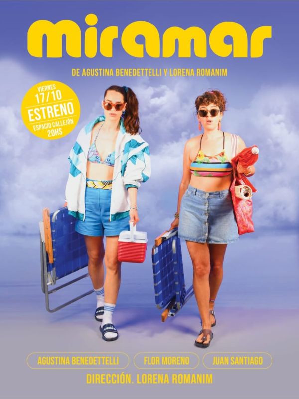 La obra MIRAMAR protagonizada por Agustina Benedettelli, Flor Moreno y Juan Santiago, bajo la dirección de Lorena Romanin y con dramaturgia de Agustina Benedettelli y Lorena Romanin, se estrenará el 17 de octubre y se presentará todos los viernes de octubre y noviembre en el Espacio Callejón a las 20:00 horas.