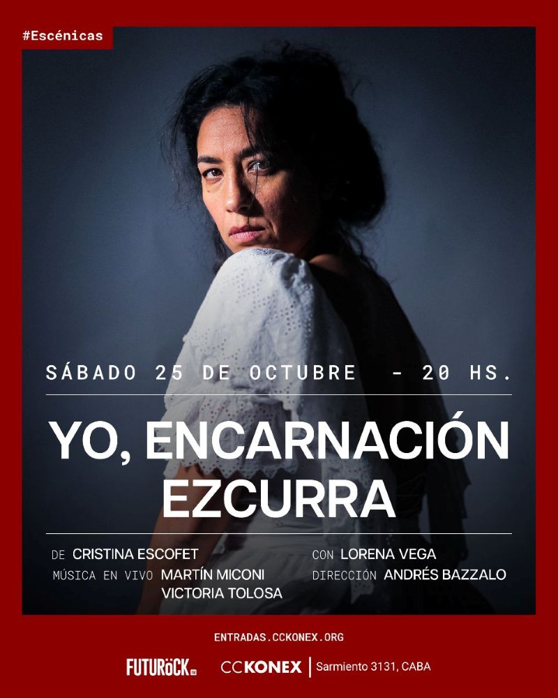 El sábado 25 de octubre a las 20:00 horas, en Ciudad Cultural Konex, se realizará una función especial de “Yo, Encarnación Ezcurra”, escrita por Cristina Escofet, interpretada por Lorena Vega y dirigida por Andrés Bazzalo, con música en vivo de inspiración folklórica, bajo la dirección musical de Agustín Flores Muñoz.