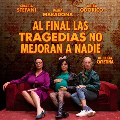 “Al final las tragedias no mejoran a nadie” es una comedia dramática que invita a reflexionar con humor sobre los duelos, los deseos y las segundas oportunidades. Escrita y dirigida por Julieta Cayetina, la obra cuenta con un elenco de destacadas actrices: Graciela Stefani, Miriam Odorico y Dalma Maradona.