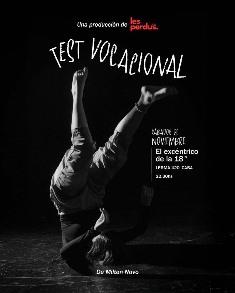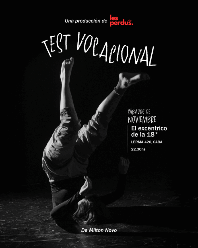 La obra de Milton Novo, “Test vocacional”, quien también dirige junto a Matías Tapia, se esta presentando en El Excéntrico de la 18° los días sábados a las 22:30 horas y el 22 de noviembre llega la última función de este año (quedan solo 2 funciones).