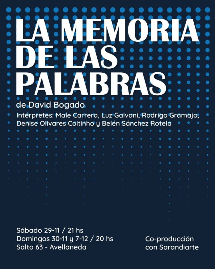El dramaturgo y director David Bogado estrenará la obra “La memoria de las palabras” en Sarandiarte Espacio Cultural, las funciones serán el día sábado 29 de noviembre a las 21:00 horas y los días domingo 30 de noviembre y 07 de diciembre a las 20:00 horas.