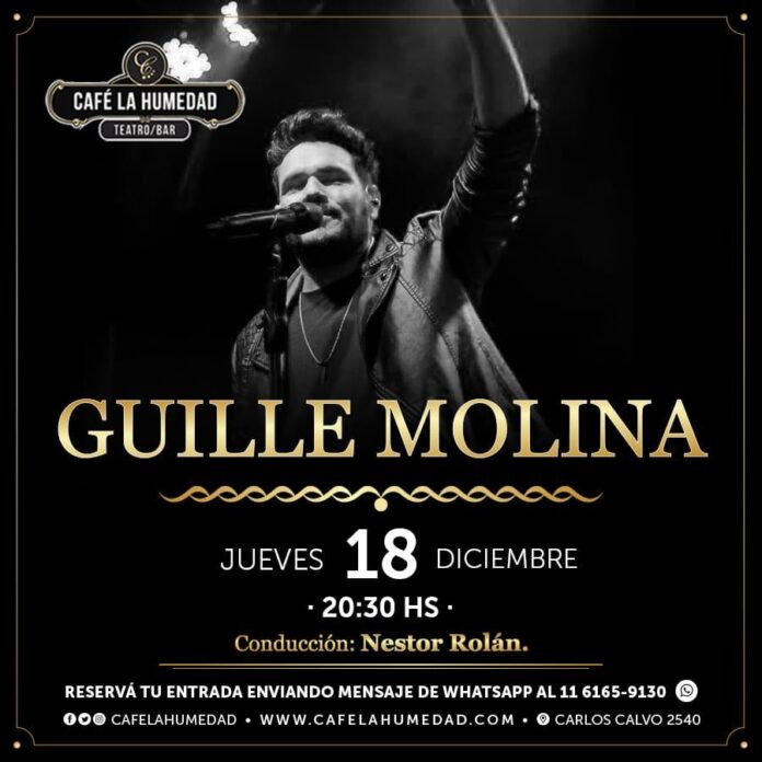 Hoy te contamos que GUILLE MOLINA termina el año en CAFÉ LA HUMEDAD, con un show extraordinario, donde la voz cordobesa que le canta al amor, nos regalará temas propios y también versiones muy personales de clásicos de todos los tiempos, para compartir una noche llena de emociones.