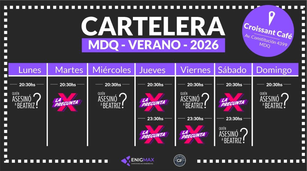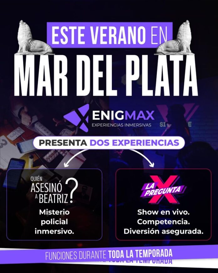La productora Enigmax (creadores de experiencias lúdicas que fusionan teatro, tecnología y juego, a cargo de Sebastián Antonio De María y Mariano Rizzuto) anuncia su debut en la temporada de verano de Mar del Plata con dos de sus obras más aclamadas: “Quién Asesinó a Beatriz?” y “La Pregunta X”. Ambas propuestas se estrenan el viernes 2 de enero de 2026 en el espacio de Crossi – Sucursal Constitución, ofreciendo una experiencia teatral única, ideal para vivir en grupo.