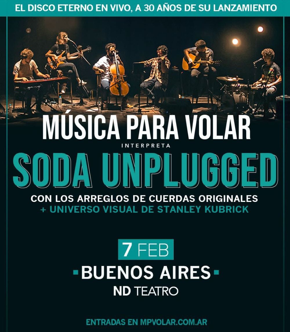 A 30 años del Unplugged de Soda Stereo, el 07 de febrero de 2026 en el Teatro ND, el grupo Música para Volar se presentará en Buenos Aires con su espectáculo “Soda Unplugged + Kubrick”, en el cual interpretarán en forma íntegra el disco emblemático de Soda Stereo, con los arreglos de cuerdas originales y una puesta que combina los momentos musicales con proyecciones sincronizadas de la filmografía de Stanley Kubrick, interpretarán en forma íntegra el disco de la banda liderada por Gustavo Cerati, grabado en 1996.