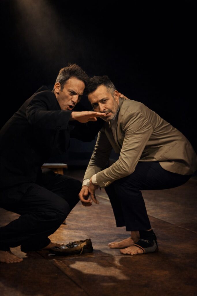 El cuerpo, el ritmo, el sonido y el silencio construyen la dramaturgia tanto como la palabra. Dos cuerpos sosteniendo el mundo mientras esperan. Dos cuerpos sosteniéndose