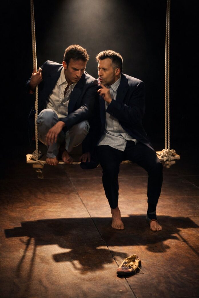 El cuerpo, el ritmo, el sonido y el silencio construyen la dramaturgia tanto como la palabra. Dos cuerpos sosteniendo el mundo mientras esperan. Dos cuerpos sosteniéndose