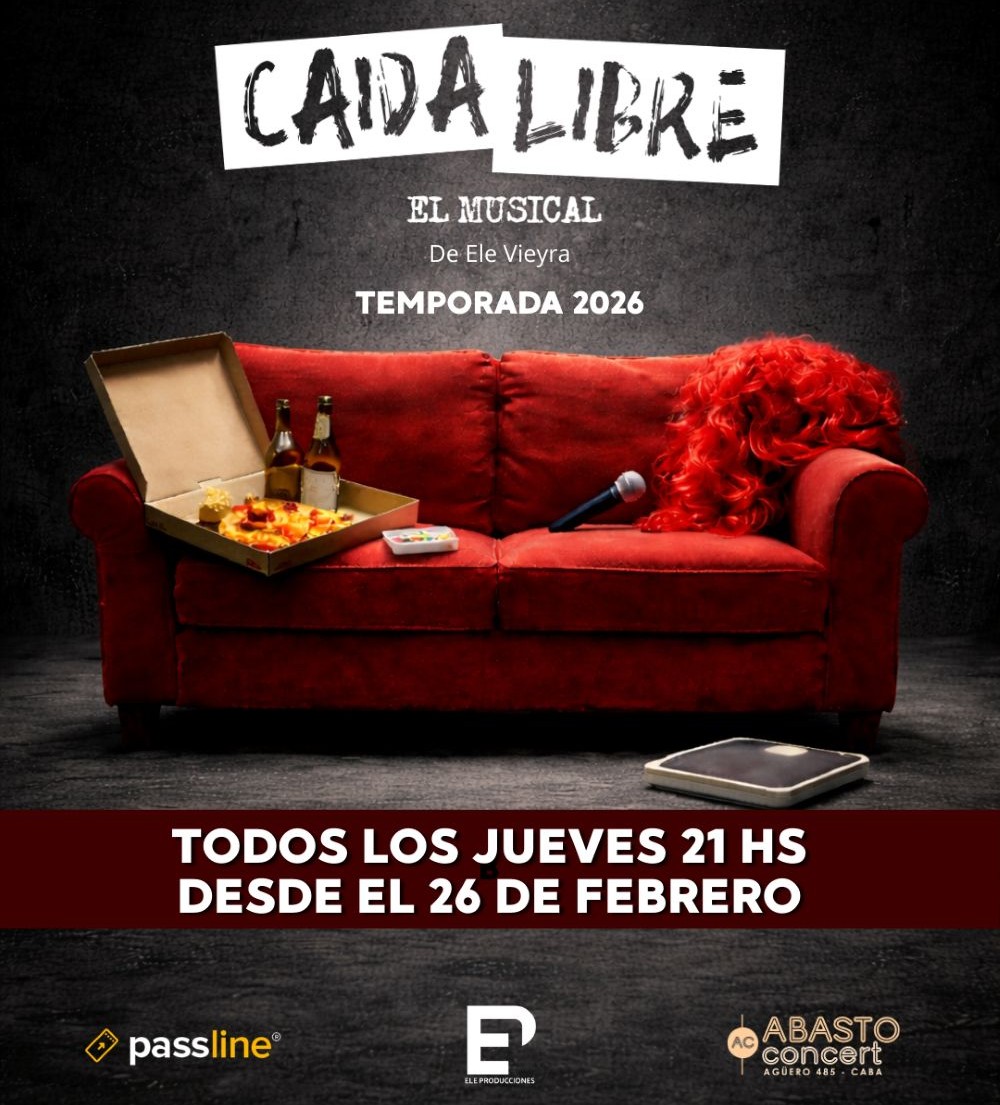 El próximo jueves 26 de febrero a las 21:00 horas estrena una nueva temporada en el Abasto Concert, “Caída Libre – El Musical”, una obra original con libro y letras de Ele Vieyra, composición musical de Ele Vieyra y Fert Álvarez, y dirección general de Ele Vieyra. La obra continuará todos los jueves de marzo y abril a las 21:00 horas.