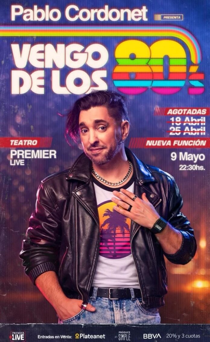 El actor, músico y comediante Pablo Cordonet estrenará su nuevo espectáculo de humor Vengo de los 80’s el sábado 18 de abril a las 22:30 horas en el Teatro Premier, función que ya se encuentra completamente agotada a un mes de su estreno. La segunda función, programada para el sábado 25 de abril, también agotó sus localidades con anticipación, consolidando un fuerte interés del público. Debido a esta gran demanda, se agrega una nueva fecha para el sábado 9 de mayo, a las 22:30 horas.